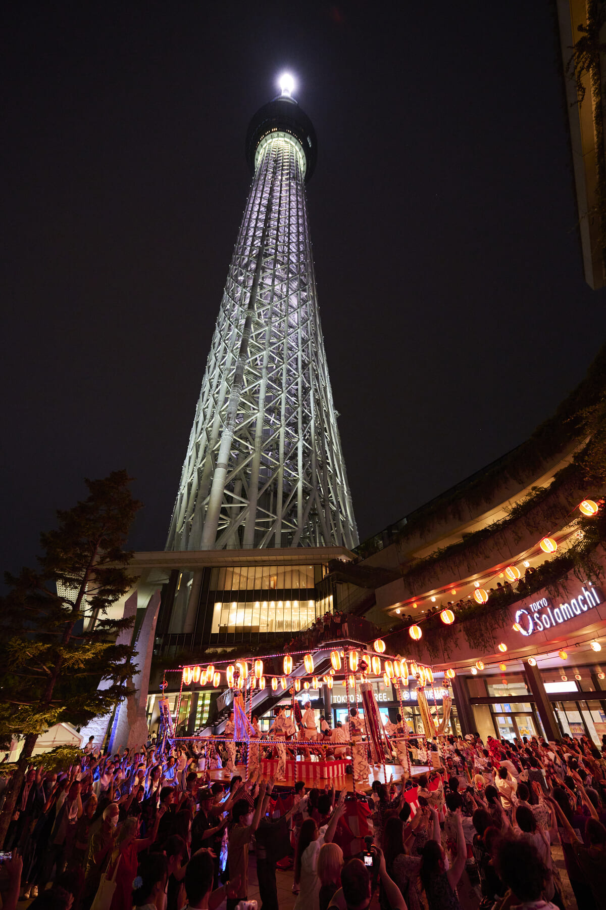 東京スカイツリー(R)の足元にやぐらが建ち、夏の風物詩である盆踊りを楽しむことができます。