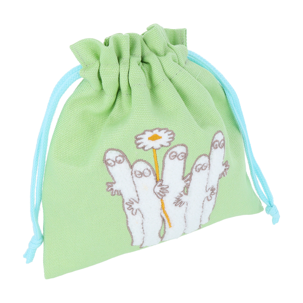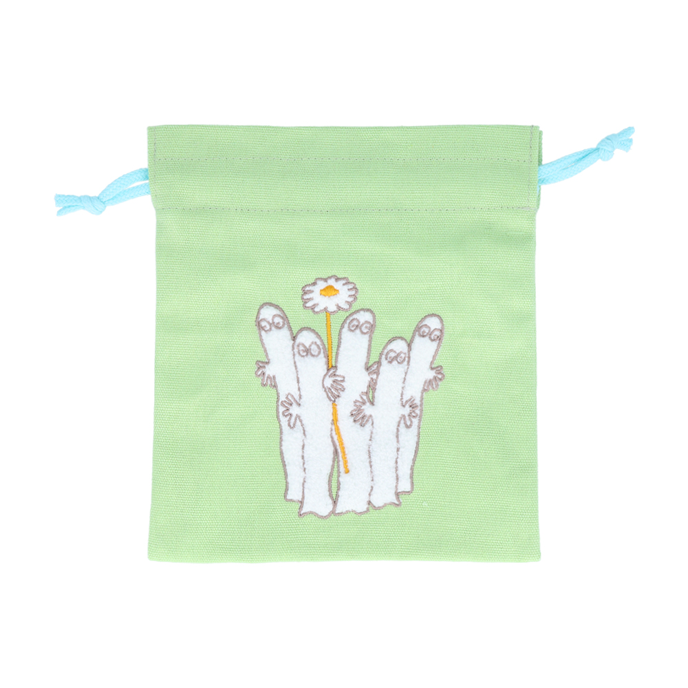 明るいグリーンの生地に、刺繍で「ニョロニョロ」を表現した巾着袋。