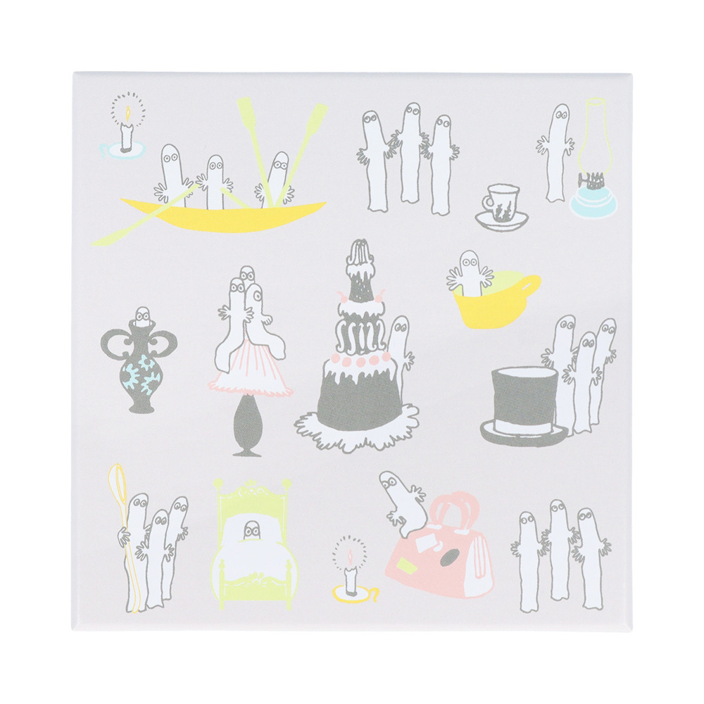 ムーミンファミリーと「リトルミイ」のイラストなど、物語のワンシーンを切り取ったデザイン。