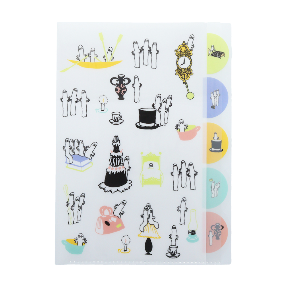 いろいろなところに姿を見せる「ニョロニョロ」たちを散りばめた、明るいデザインのクリアファイル。