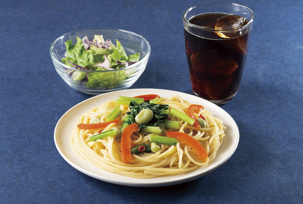 日本三大昆布のひとつとされている利尻昆布のだしの旨みと、唐辛子の程よい辛味の効いた味わいが楽しめる「彩り野菜と利尻昆布だしの和風ペペロンチーノ」