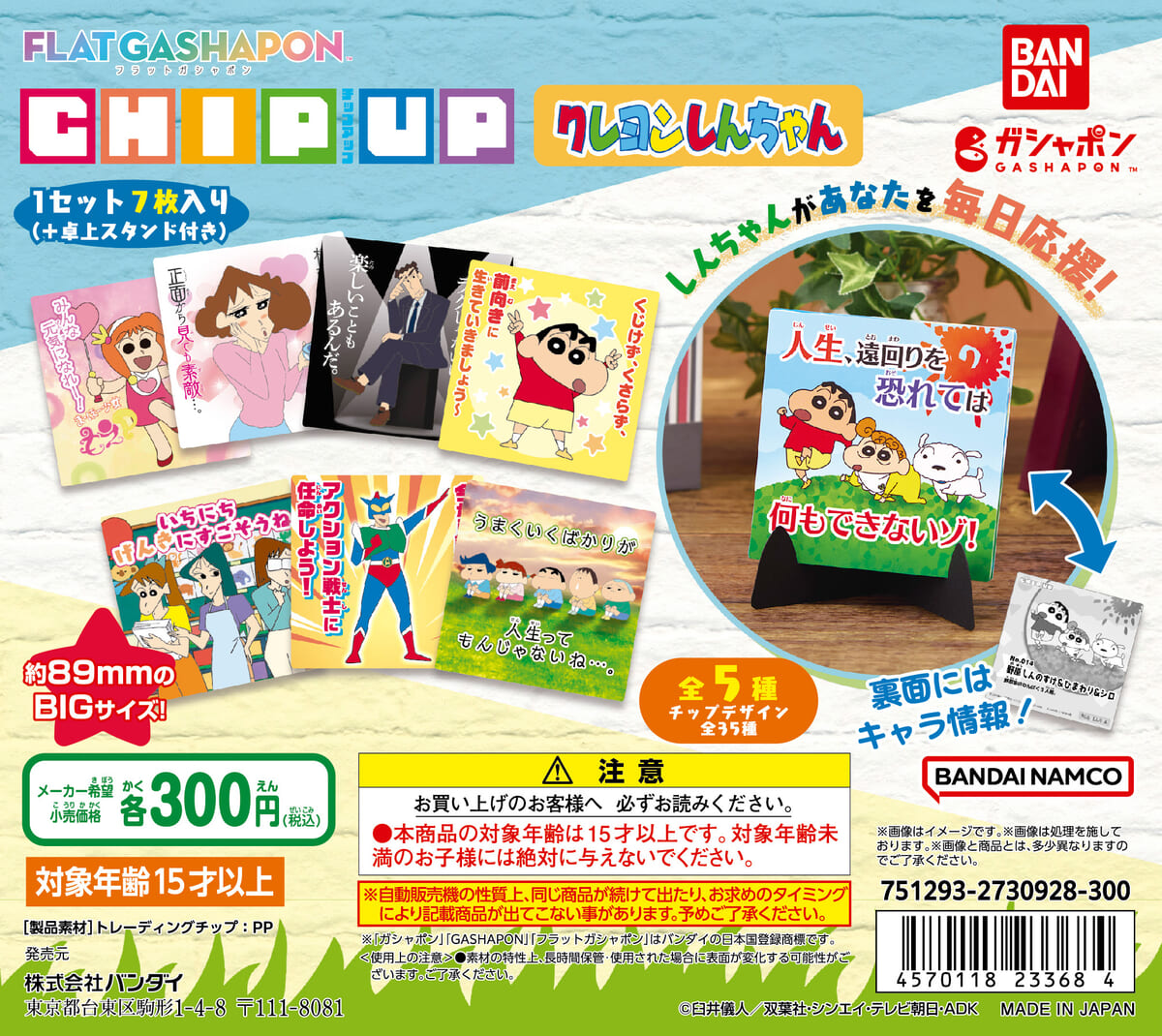 チップをめくるとキャラクターたちがメッセージで応援してくれる「CHIP UP クレヨンしんちゃん」がバンダイのフラットガシャポンに登場!