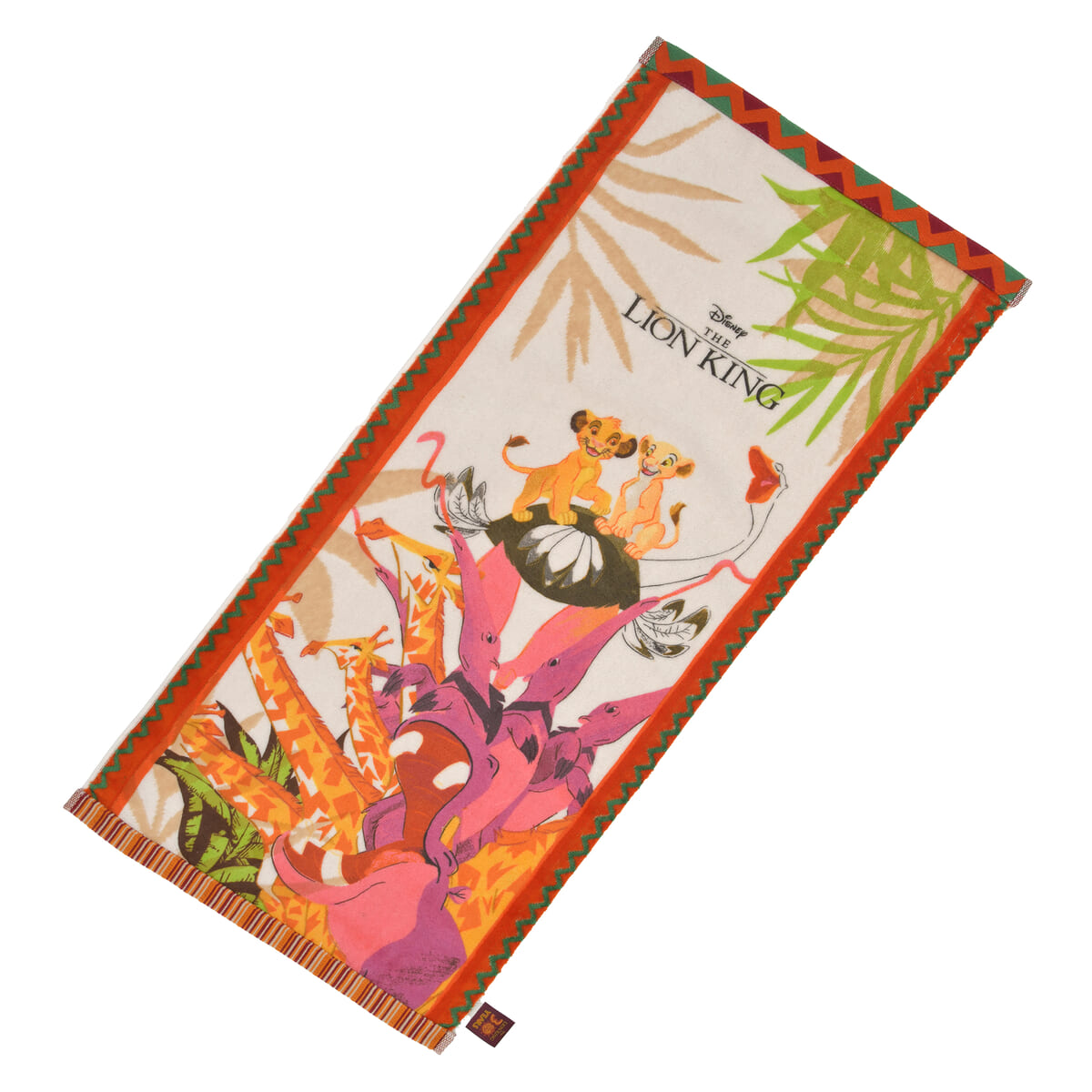 「シンバ」と「ナラ」「ザズー」のかけ合いが楽しい曲「王様になるのが待ちきれない」のシーンをモチーフにしたプリントタオル。