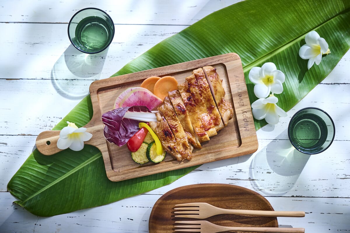 鶏肉を回しながら直火で焼くローカルフードをオリジナルアレンジした“フリフリチキン”、そして、ガーリックシュリンプとアボカドでハワイアンテイストに仕上げた石窯ピッツァなどが日替わりで登場。