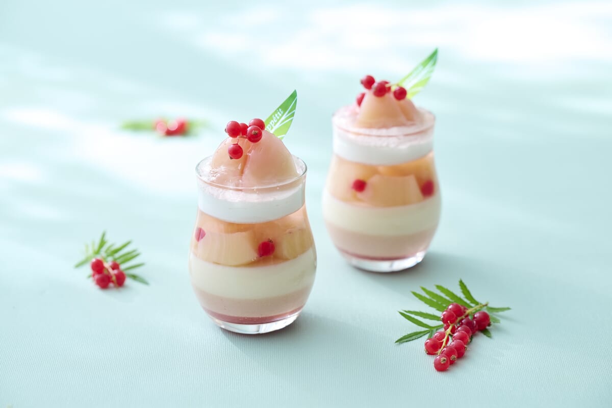 赤桃や白桃などを、ソース、ゼリー、ムースといった美しい層も楽しめる、旬の桃づくしのグラスデザート。