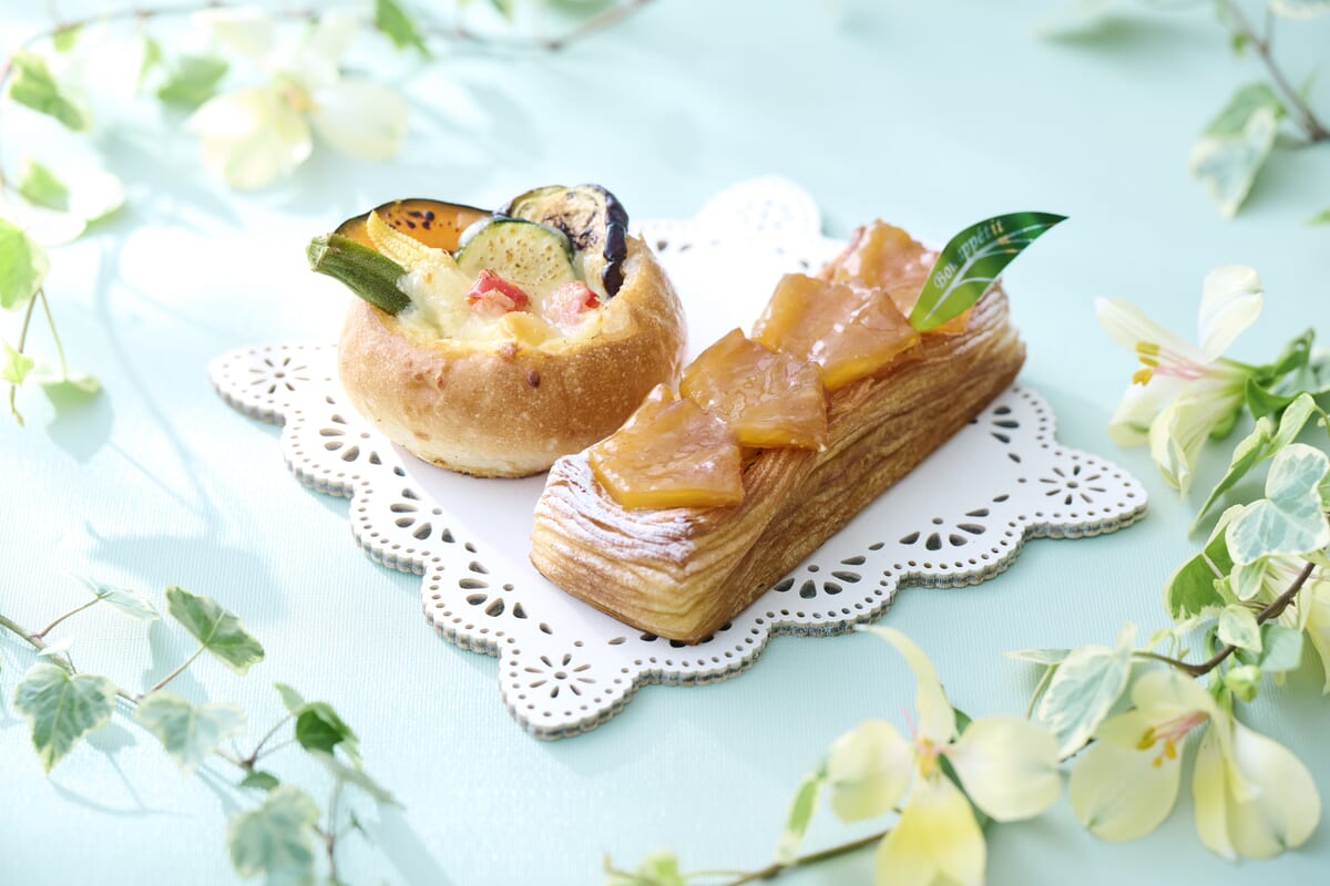 マンスリーベーカリーとして「夏野菜のブールキッシュ」と「キャラメルパインデニッシュ」がラインナップ。