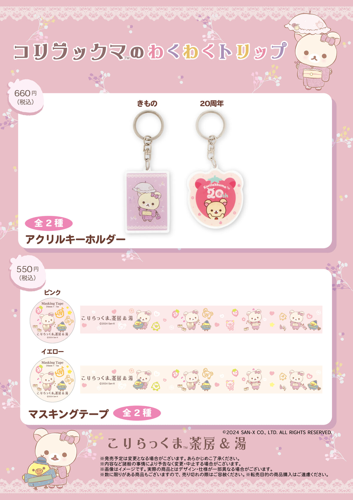 着物姿の「コリラックマ」や20周年アートを使用したアクリルキーホルダーと