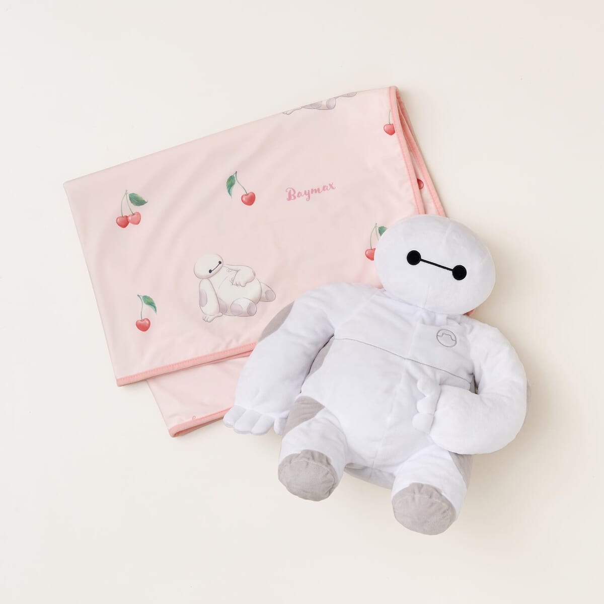 お腹に手を当てながらお座りする「ベイマックス」をデザインしたクールブランケット。