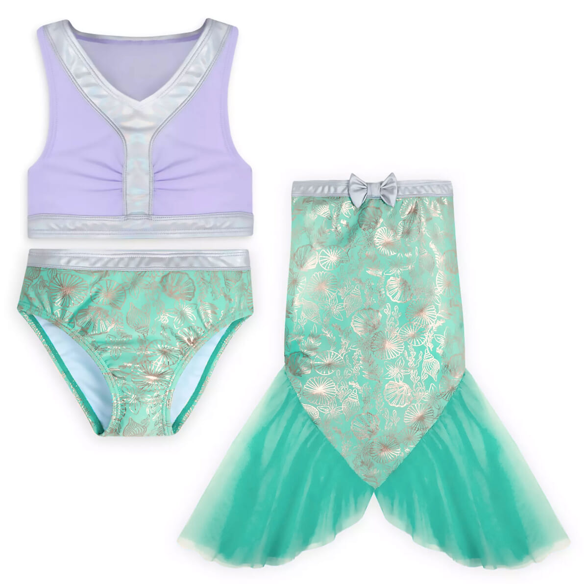 『リトル・マーメイド』のディズニープリンセス「アリエル」デザインは、セパレートタイプのスイムウェアとロングスカートの3点セット。