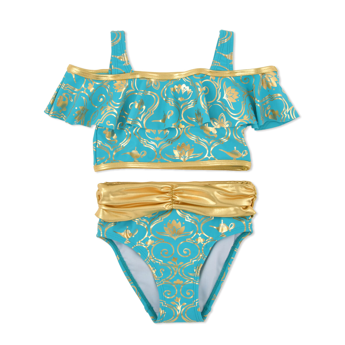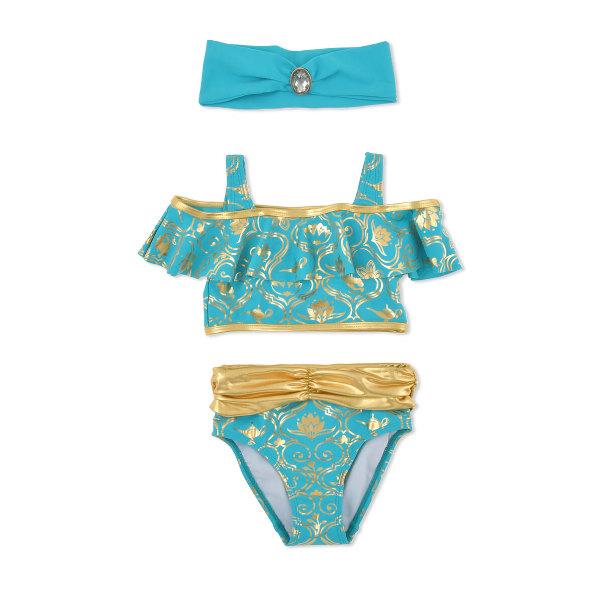 『アラジン』のディズニープリンセス「ジャスミン」デザインは、セパレートタイプのスイムウェアとヘアバンドの3点セット。