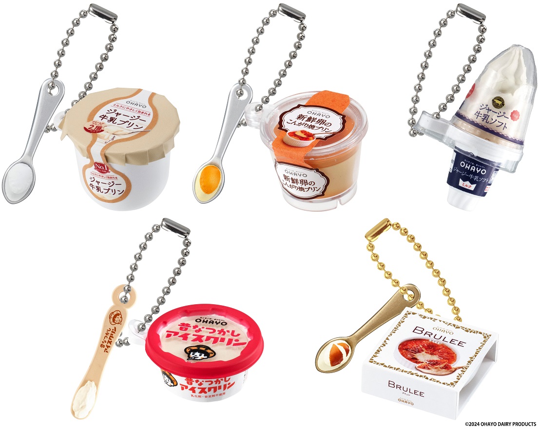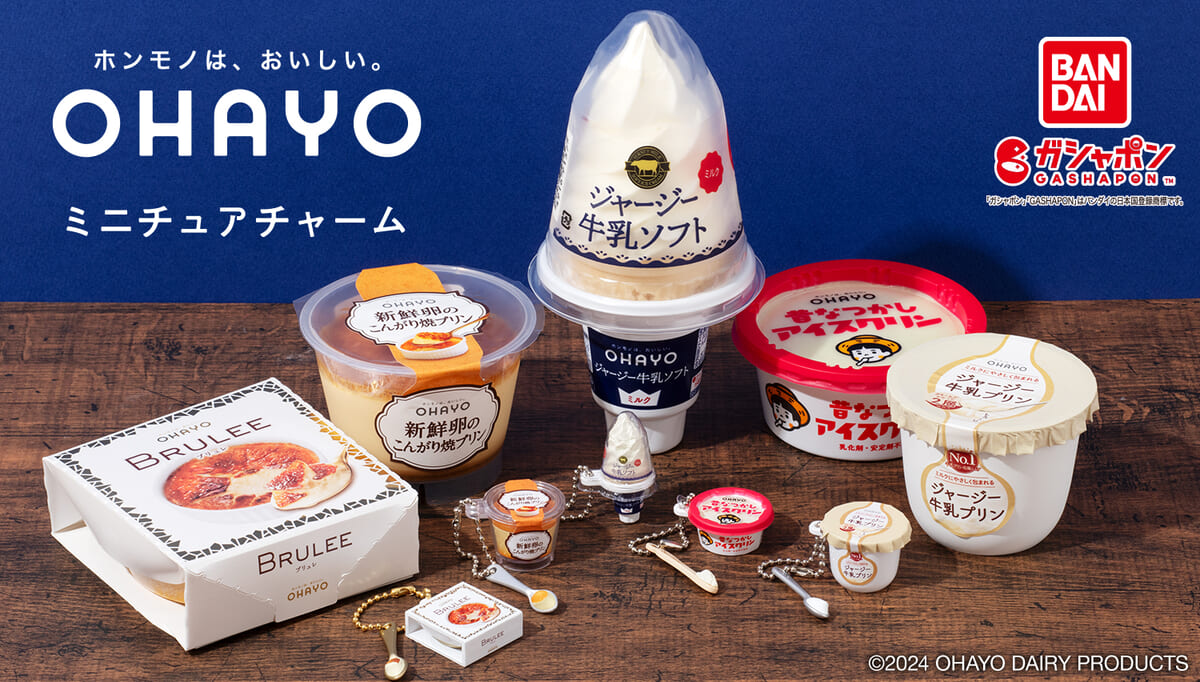 バンダイのカプセルトイ「ガシャポン」に、オハヨー乳業のデザート・アイスの人気スイーツ5品を再現したミニチュアチャームが登場。
