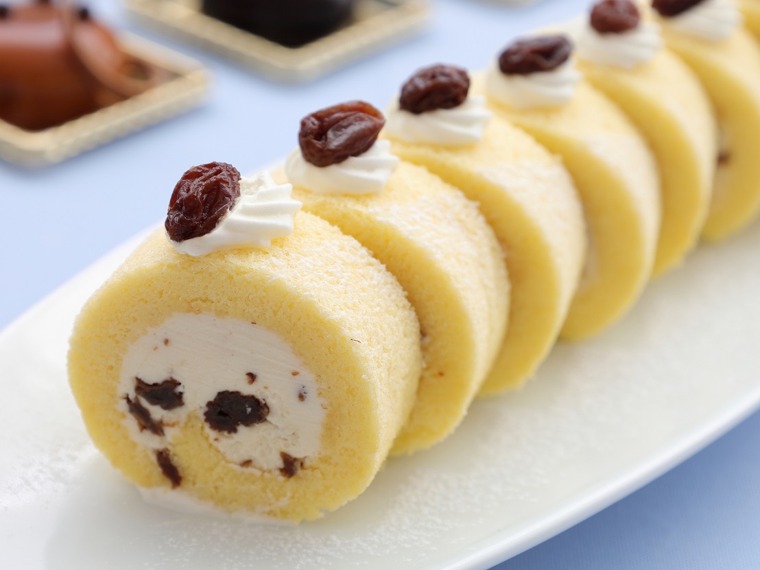 「ラムレーズンロールケーキ」は、香り豊かなラム酒に漬け込んだレーズンをたっぷり巻き込んだ、上品で大人な味のロールケーキです!