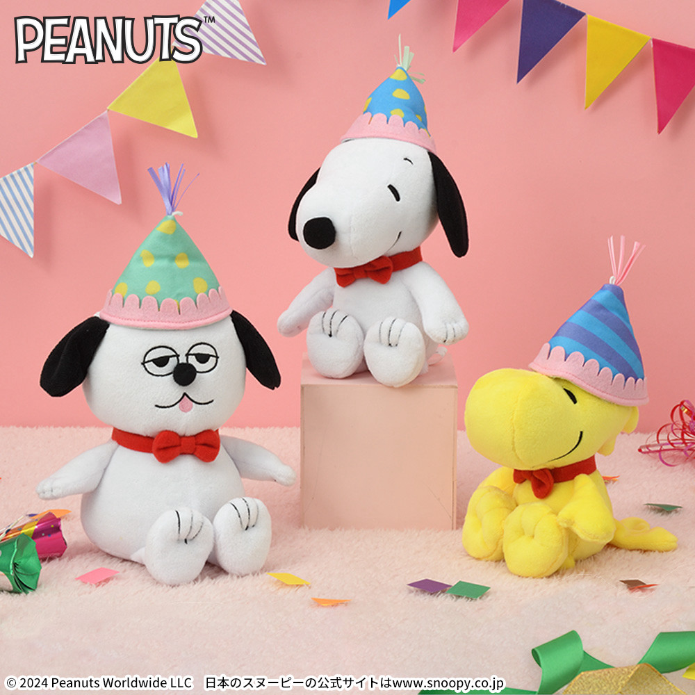 8月10日にお誕生日を迎える「スヌーピー」をデザインした、バースデーパーティー風のぬいぐるみが展開されます。