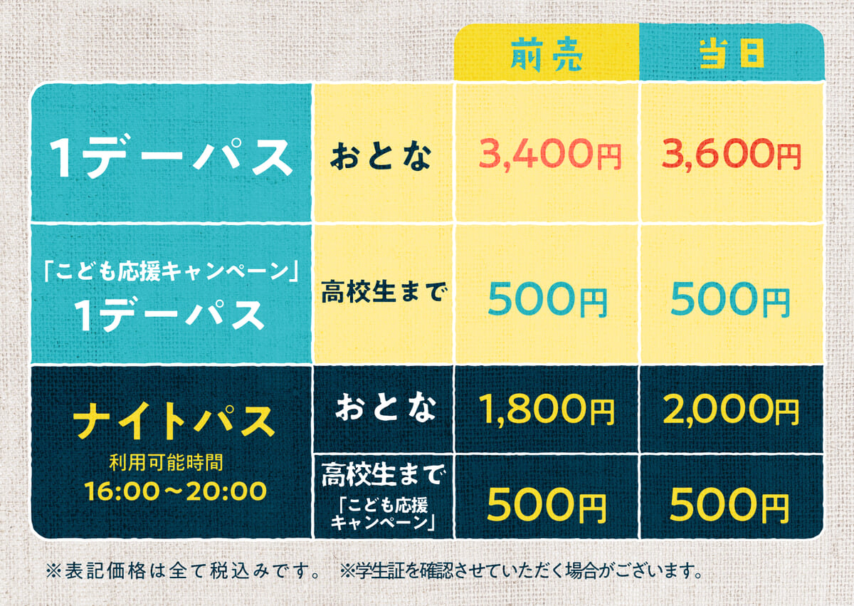 販売価格:こども1デーパス500円(税込)※中高生もこども料金で楽しめます