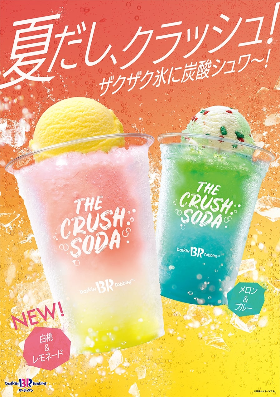 サーティワンにて、ザクザク氷とハジけるシュワシュワな炭酸に好きなアイスクリームをトッピングできる夏のアイスクリームドリンク「ザ・クラッシュソーダ」を販売中。