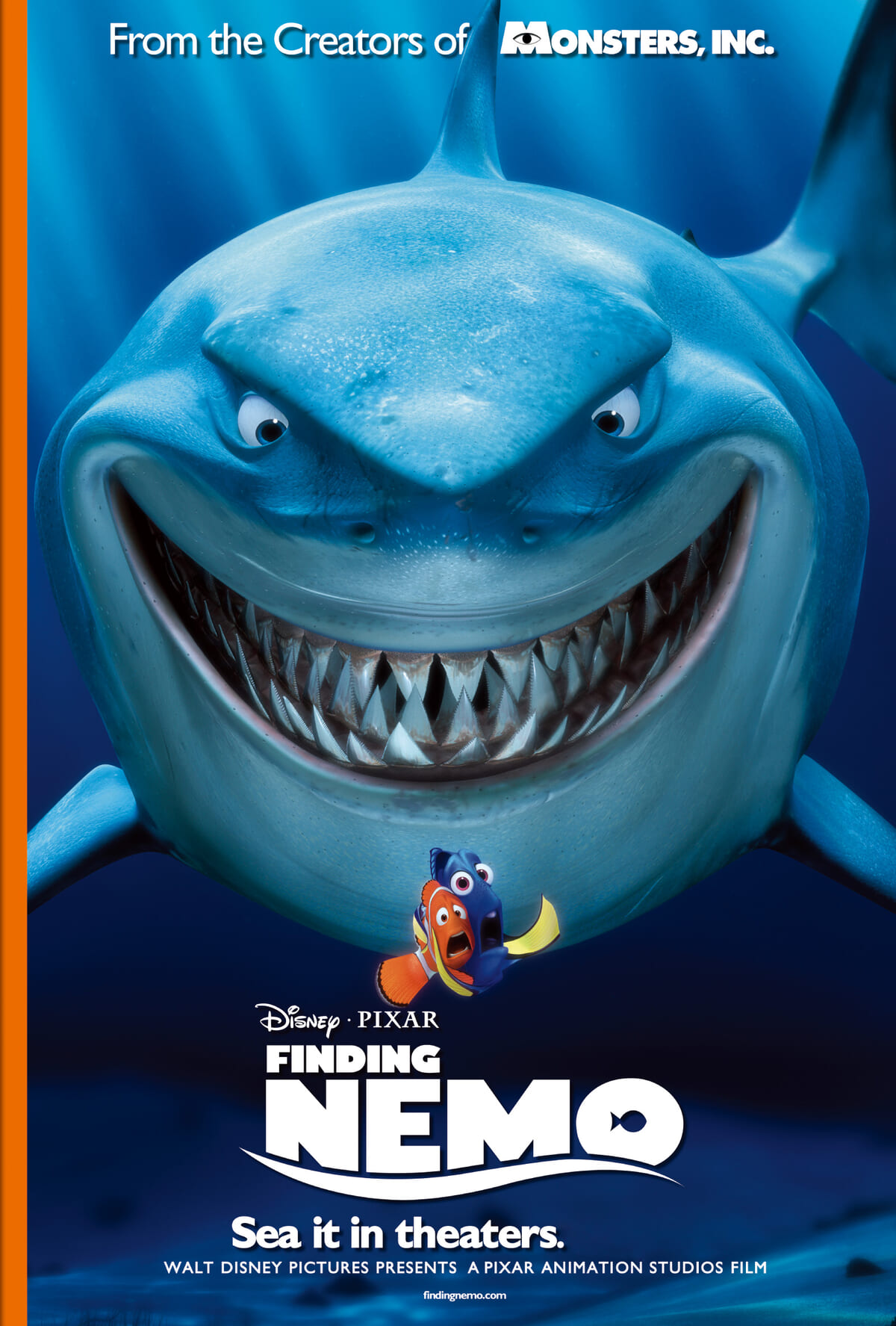 ホオジロザメの「ブルース」を背後に抱き合う「マーリン」と「ドリー」を描いた『ファインディング・ニモ』
