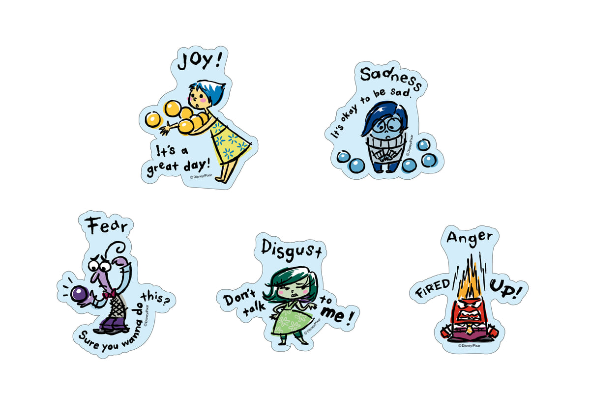 5つの感情「ヨロコビ」「カナシミ」「ビビリ」「ムカムカ」「イカリ」を描いた『インサイド・ヘッド』の全9種がラインナップされます。