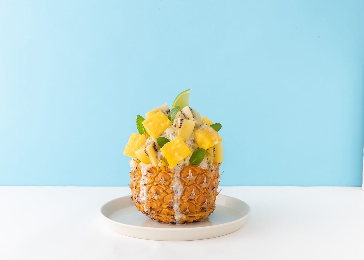 堀内果実園の「丸ごとパインとゴールドキウイ」は、パイナップルを丸ごと1個、どどんっと器に使った大胆メニュー。