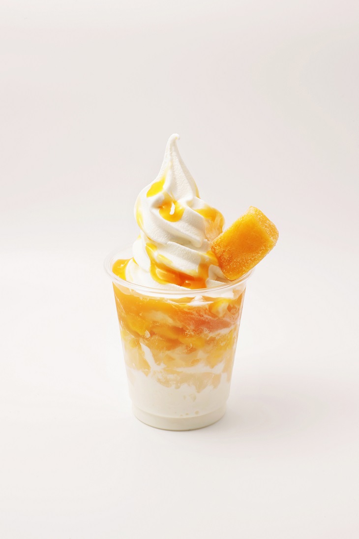 東毛酪農63℃の 「ヨーグルトマンゴーパフェ」は、甘酸っぱい風味のヨーグルトソフトに、フローズンマンゴーとマンゴーソースをたっぷりトッピング!