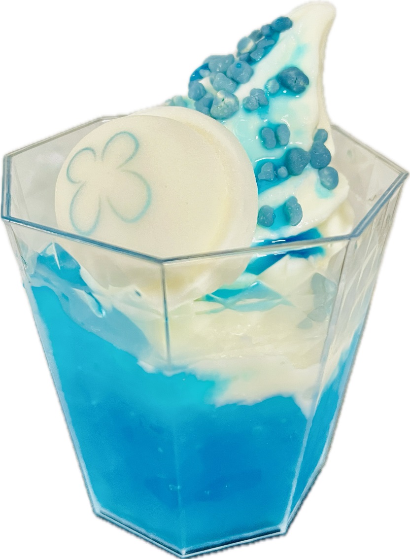 ぷるぷるゼリーと塩バニラソフトにクラゲマシュマロをトッピングした、すみだ水族館の「パチッとクラゲブルーサンデー」