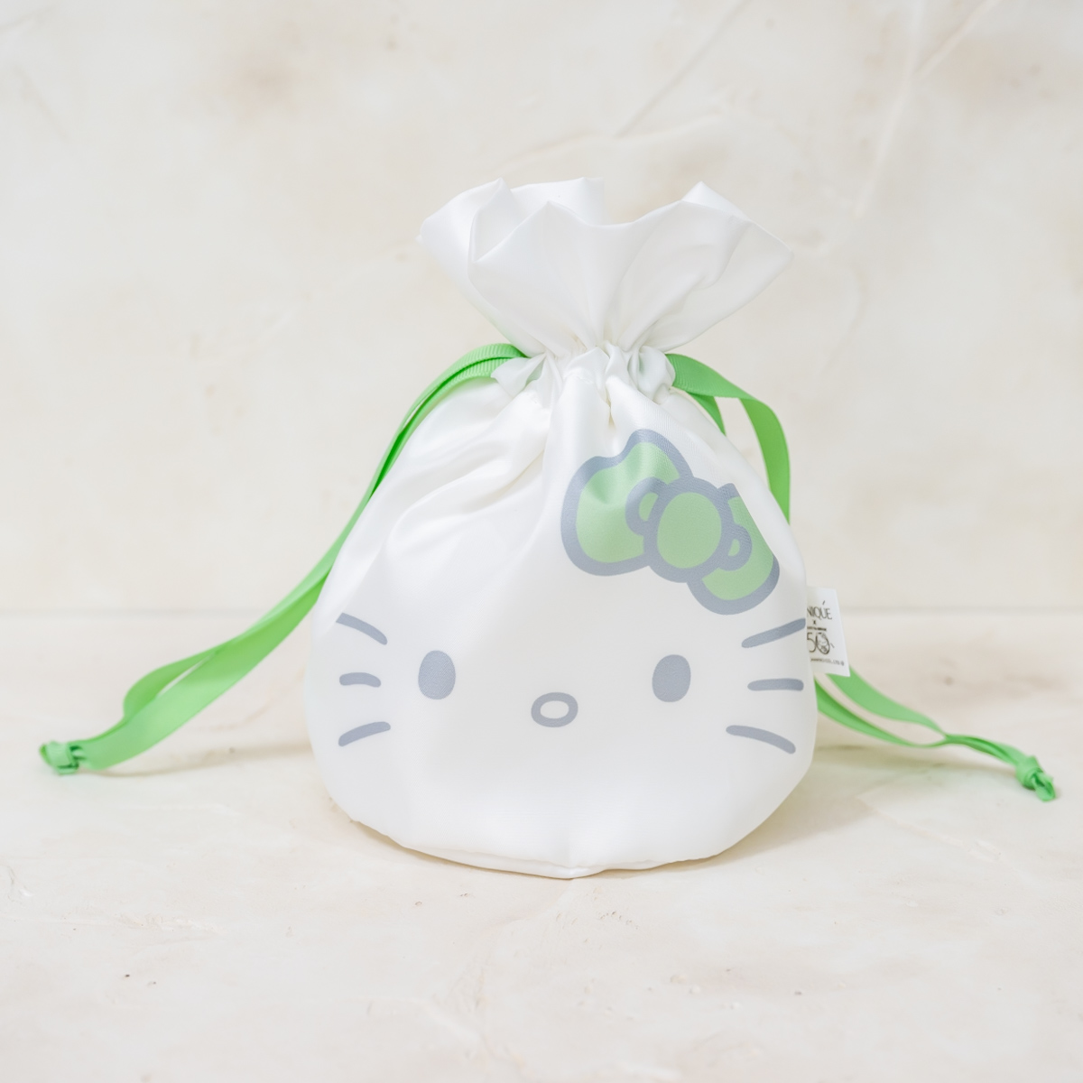 コラボレーション限定のスペシャルグッズ第1弾として「ハローキティ」の「オリジナルハンカチ」と「巾着ポーチ(2種)」が登場。