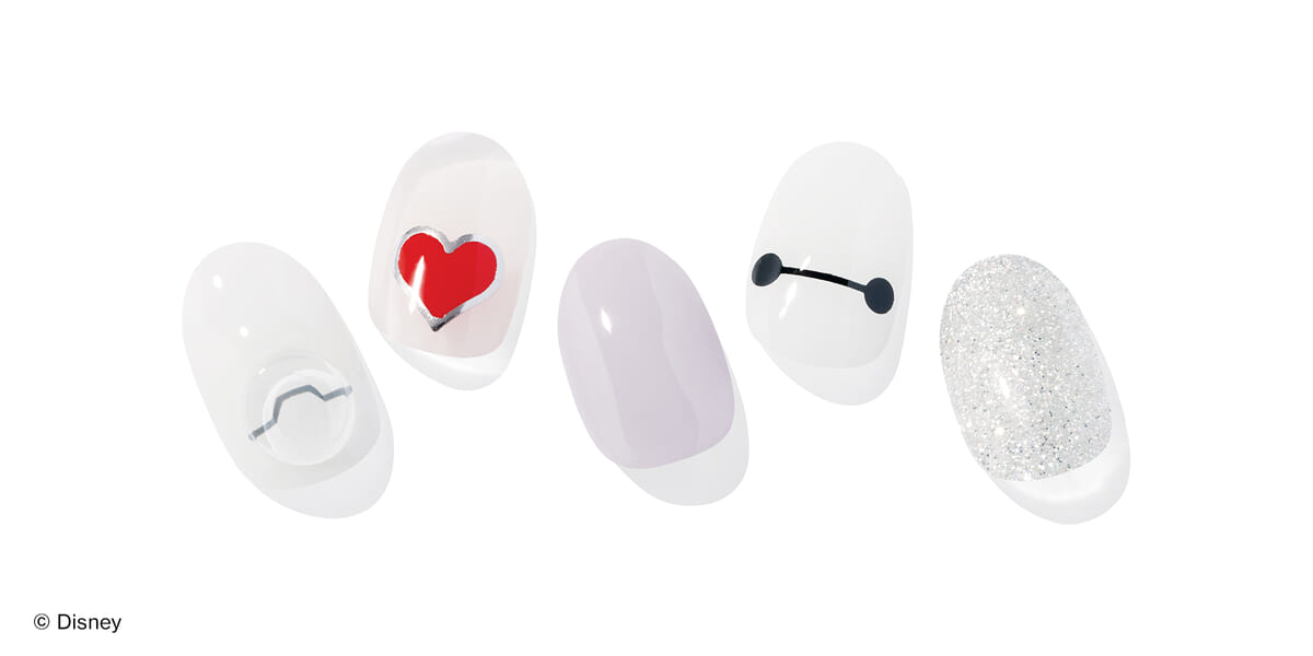『ズートピア』からは、キツネの「ニック・ワイルド」とウサギの「ジュディ・ホップス」をそれぞれモチーフにしたハンドネイル2種、『ベイマックス』からは「ベイマックス」をモチーフにしたハンドネイル1種がラインナップ。