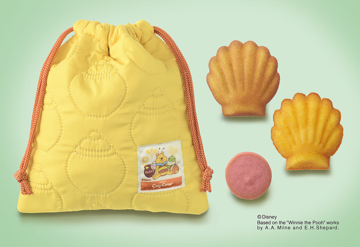 2種類のマドレーヌのほか、甘ずっぱいフランボワーズのクッキーも一緒にアソートした「<くまのプーさん>はちみつ巾着(8個入)」