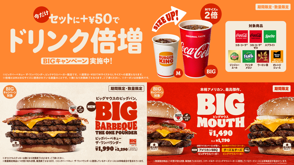 通常+50円でドリンクMサイズからLサイズへ増量のところ、今だけMサイズから倍増の“BIGサイズ”へ変更できるお得なキャンペーンです!