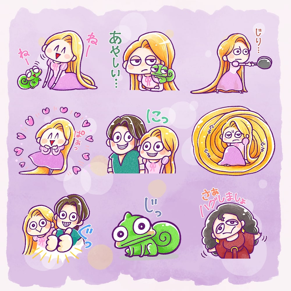 『塔の上のラプンツェル』に登場するディズニープリンセス「ラプンツェル」や「フリン・ライダー」「パスカル」「ゴーテル」をはじめとするキャラクターたちを表情豊かに描き下ろした、かわいくて楽しいLINEスタンプ。