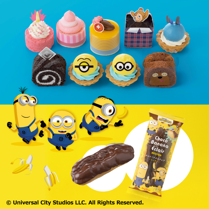 大きなゴーグルの目に黄色い体の「ミニオン」をイメージしたプチケーキや、「ミニオン」たちも大好きなバナナ味のエクレアが限定デザインのパッケージでラインナップされます☆