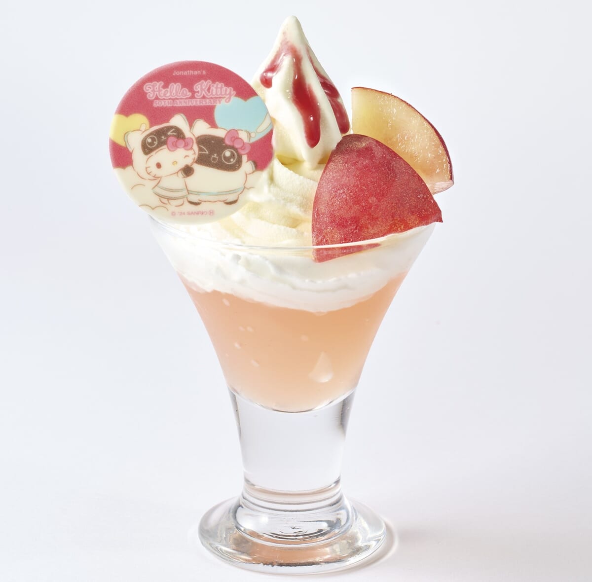桃の果汁入りゼリーに北海道産乳原料を使用したソフトクリームをのせた「ハローキティ 桃のゼリーソフト」