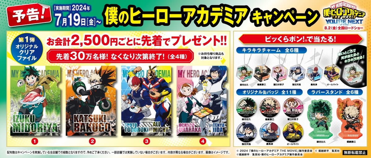 期間中「ビッくらポン!」で当たりが出ると「緑谷出久」「爆豪勝己」「麗日お茶子」「飯田天哉」「轟焦凍」「オールマイト」など人気のキャラクターグッズが手に入ります。