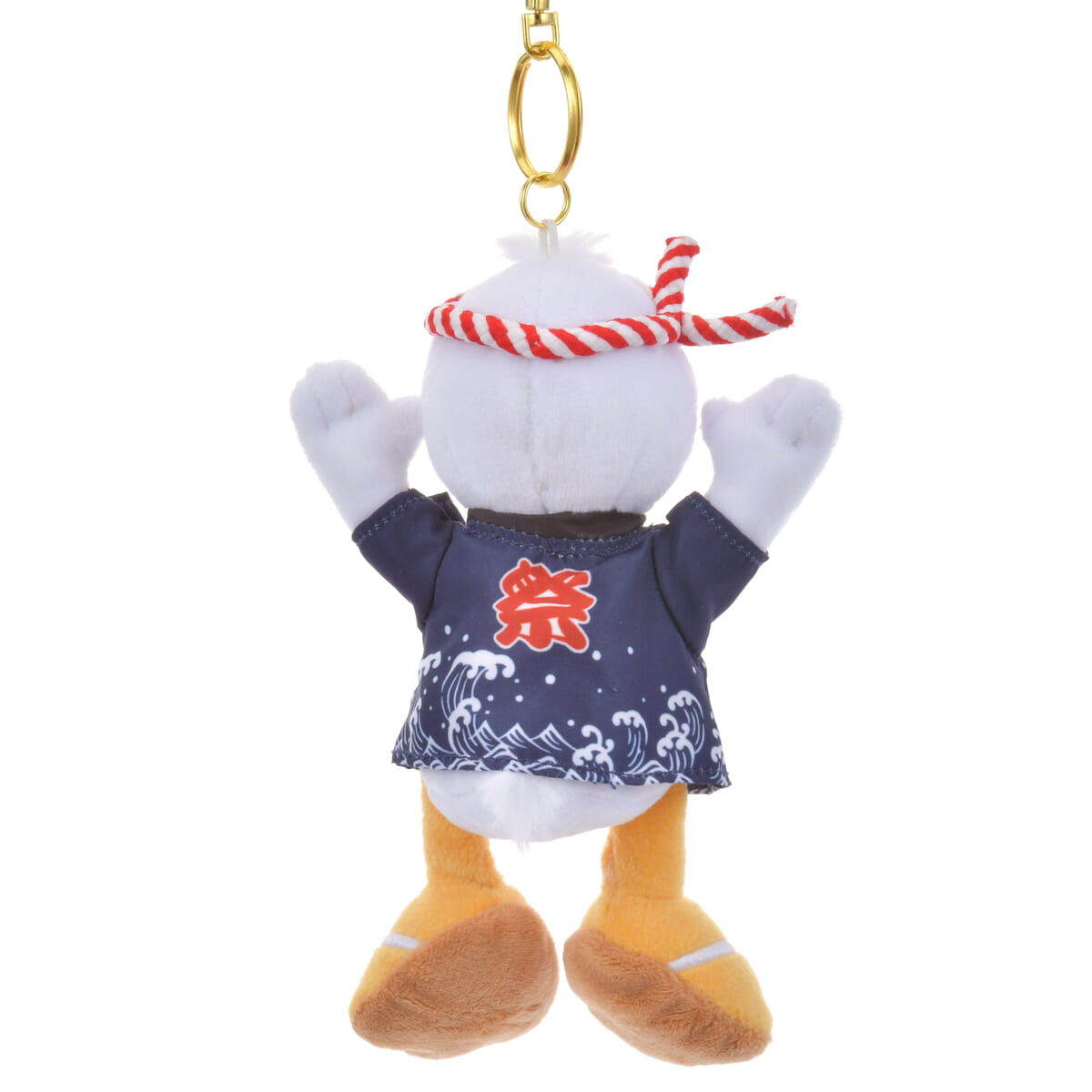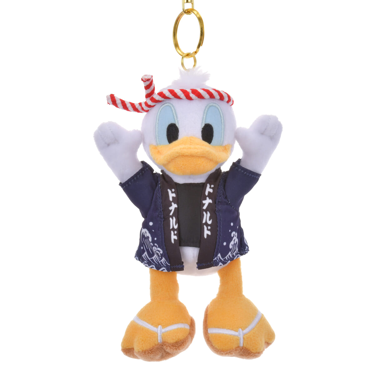 「ドナルド」と描かれた法被を着た「ドナルドダック」のぬいぐるみキーチェーン。
