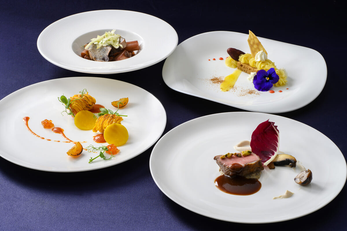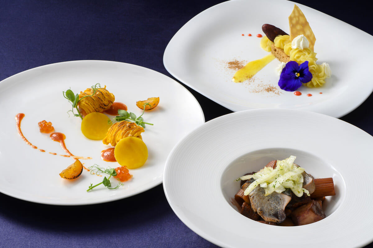 紅茶シフォンとサツマイモクリームで秋の風情を感じさせるドルチェが付いた、見た目にも美しく、季節感を存分に味わえるメニューです。