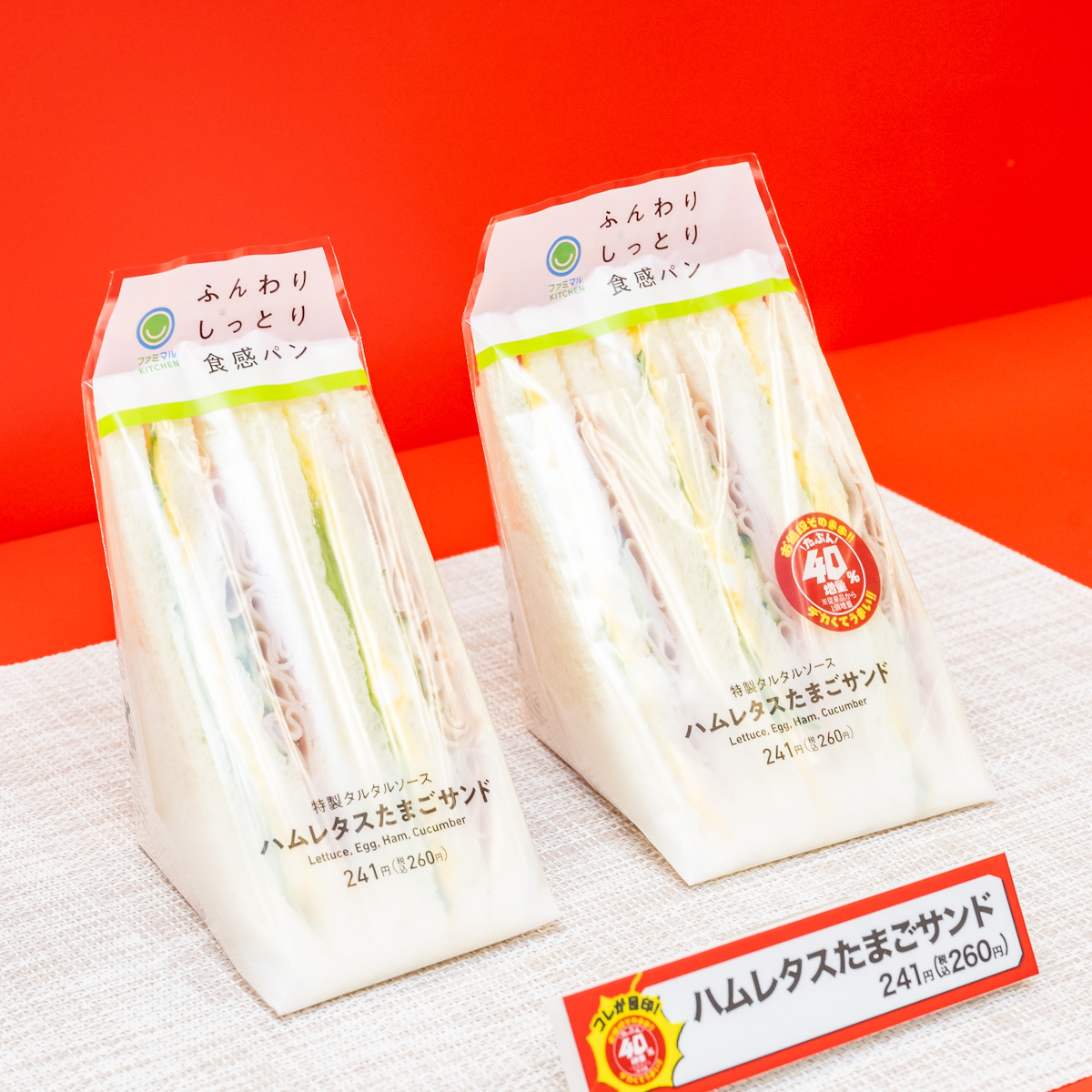 ハム・きゅうり・レタス・たまごサラダの具材を組み合わせたサンドイッチを、お値段そのまま1個増量し「たぶん40%増量」