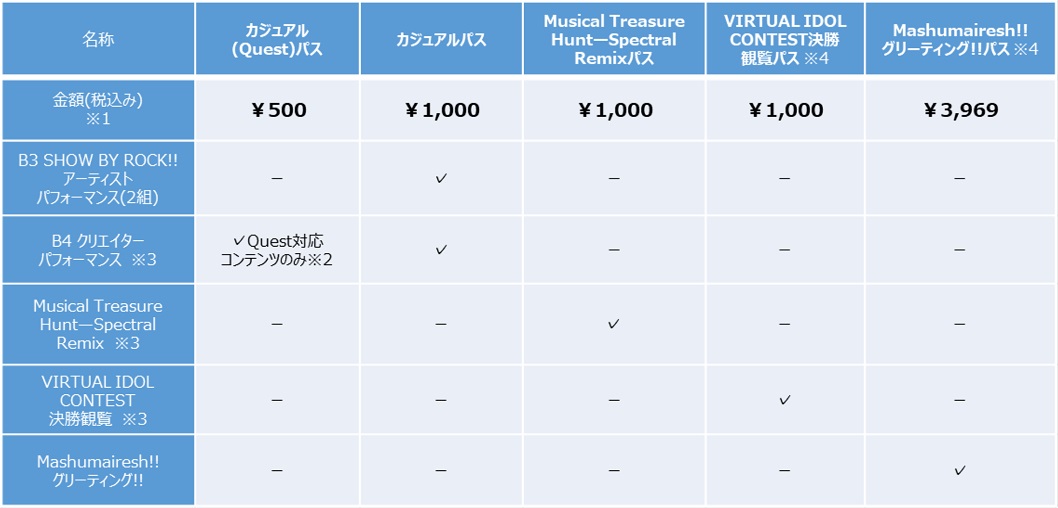 アーティストパフォーマンスや「Musical Treasure Hunt—Spectral Remix」「IDOL CONTEST」決勝の視聴、「Mashumairesh!!グリーティング!!」への参加には、チケットの購入が必要です。