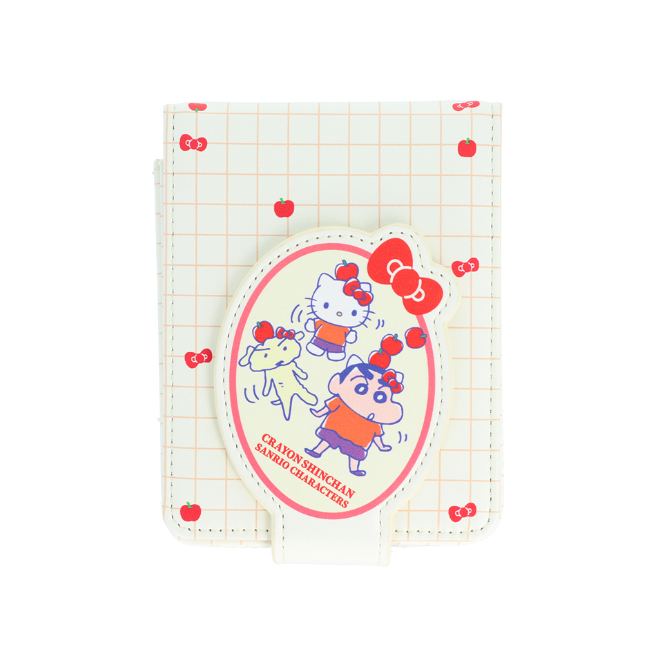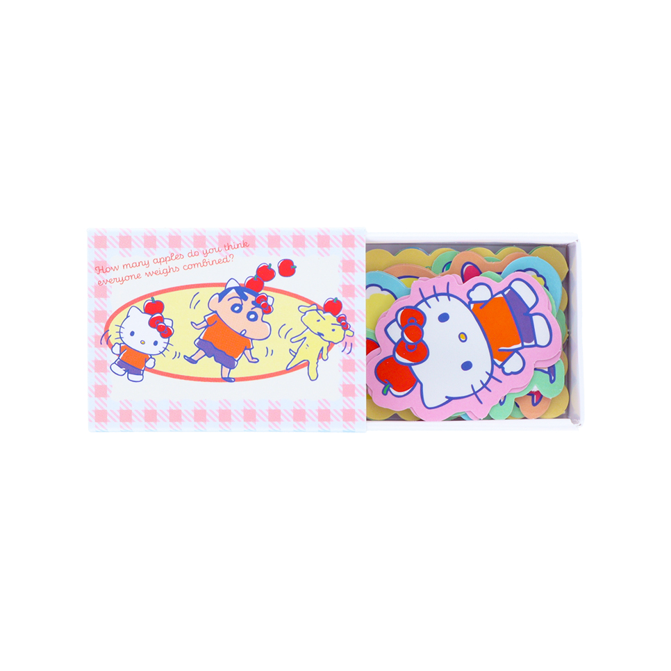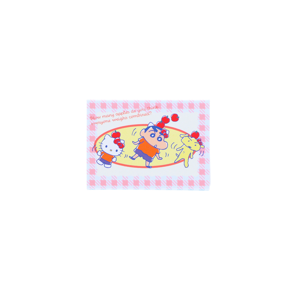 「ハローキティ」と「しんちゃん」、「シロ」がりんごを頭に乗せる、かわいいデザイン。