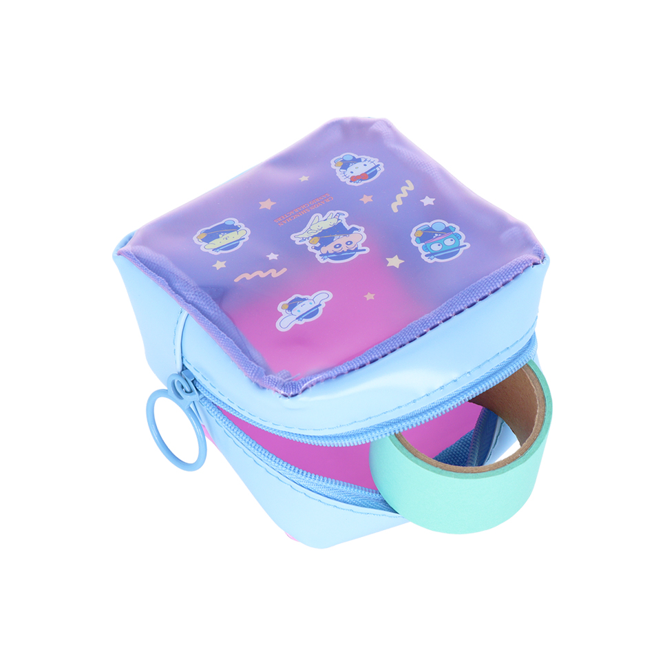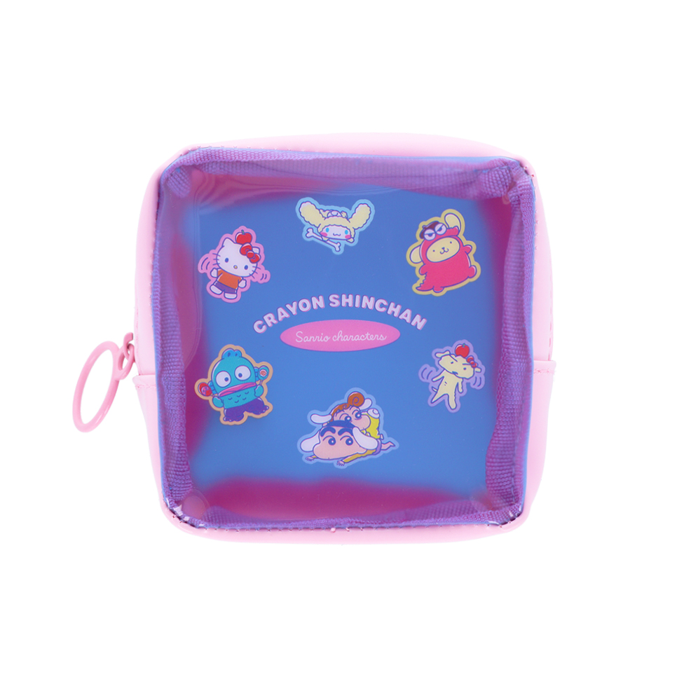 幼稚園の制服姿のキャラクター達がデザインされたクリアポーチ。