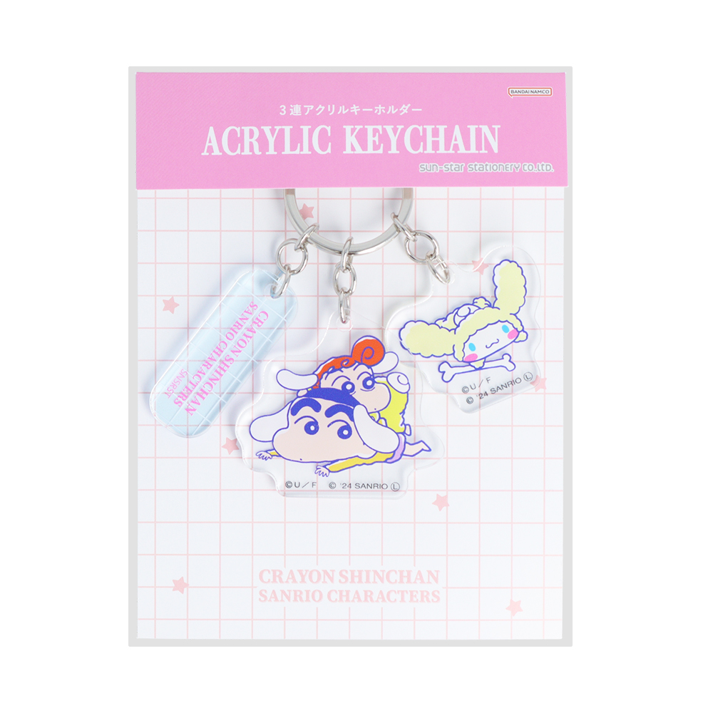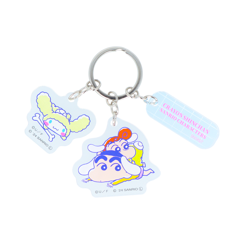 「シナモロール」のしっぽと耳を付けた「しんちゃん」と「ひまわり」、「シロ」の格好をした「シナモロール」のアクリルキーホルダー。