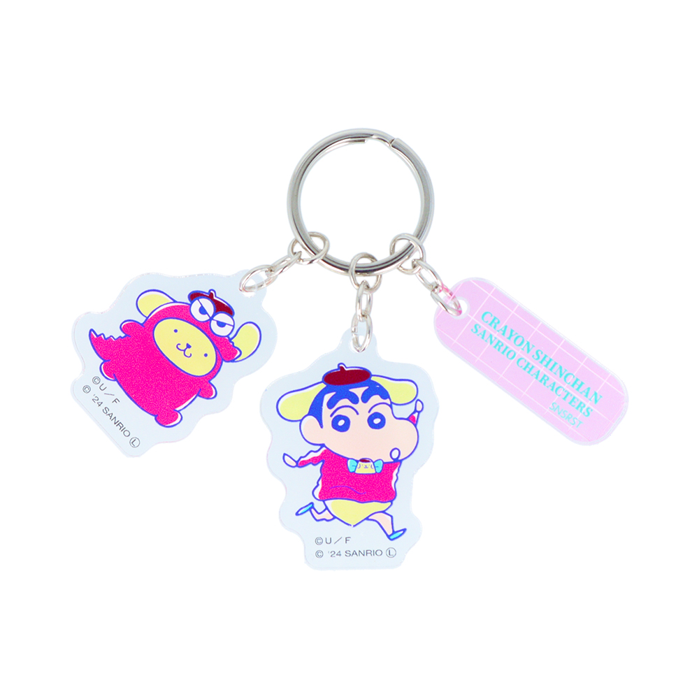 「ポムポムプリン」の帽子&耳をかぶる「しんちゃん」と、「チョコビ」の「ワニ山さん」の着ぐるみが似合う「ポムポムプリン」のアクリルキーホルダー!