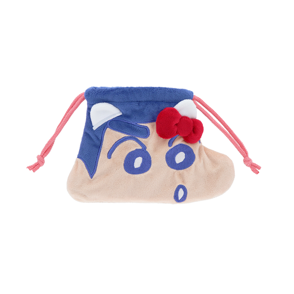 「ハローキティ」の耳とリボンを付けた「しんちゃん」のぬいぐるみ巾着。