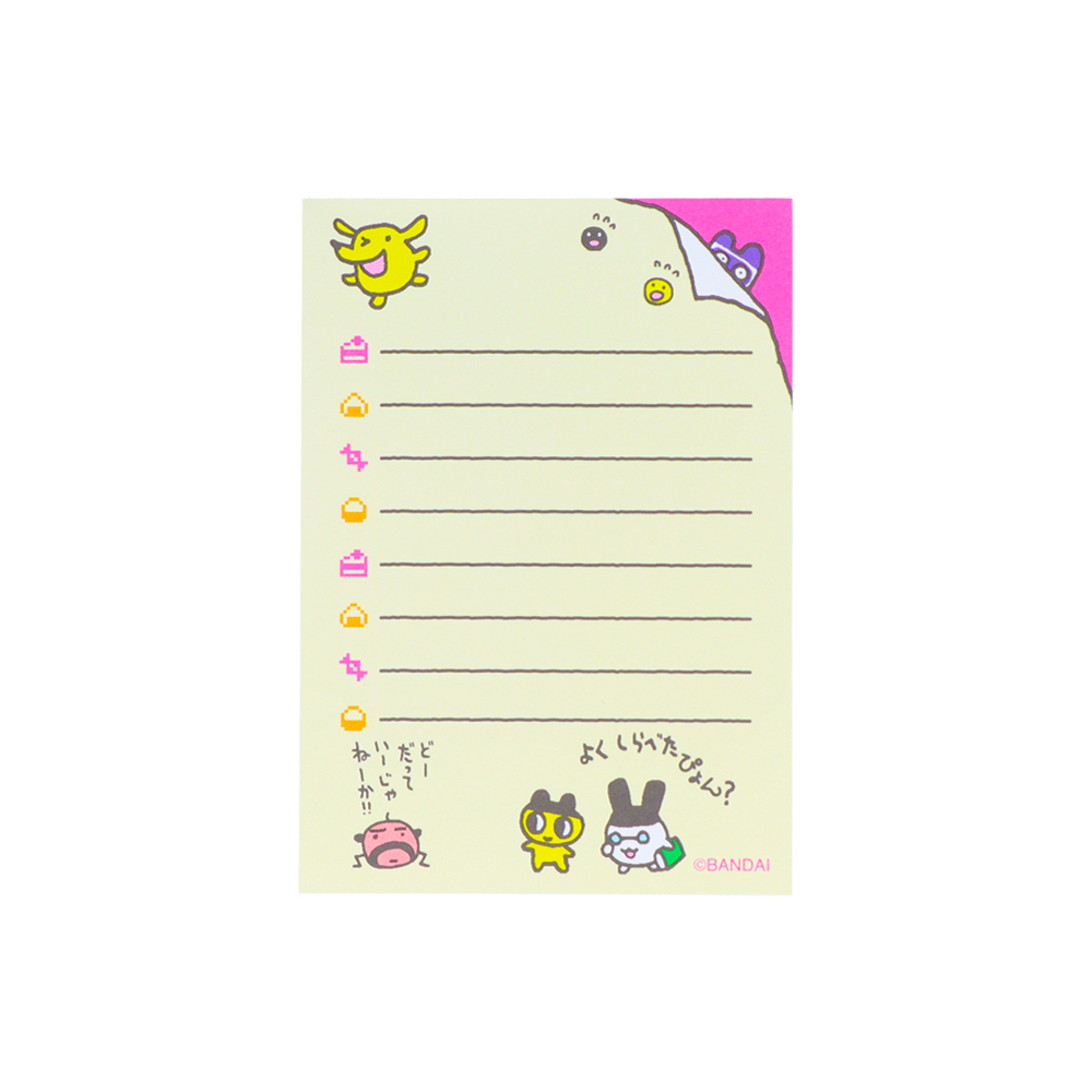 『たまごっち』本体と、いろいろな「たまごっち」がちが並ぶ、賑やかな表紙のメモミニ。