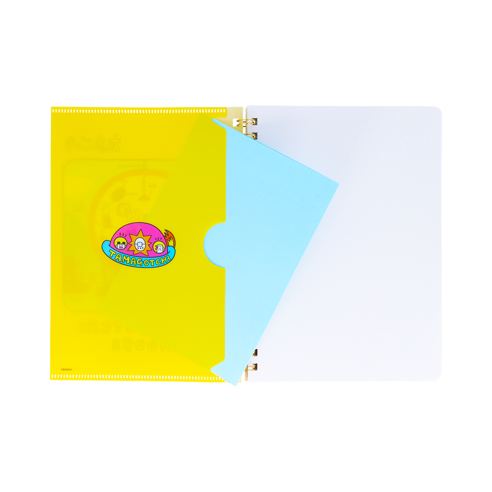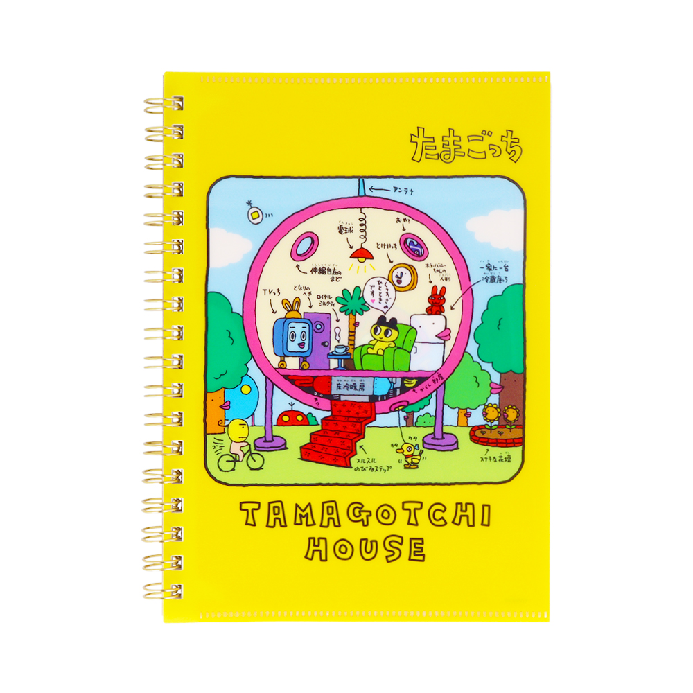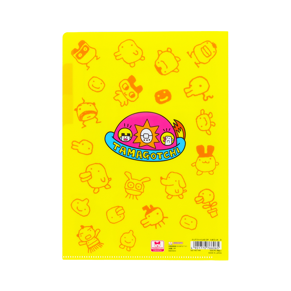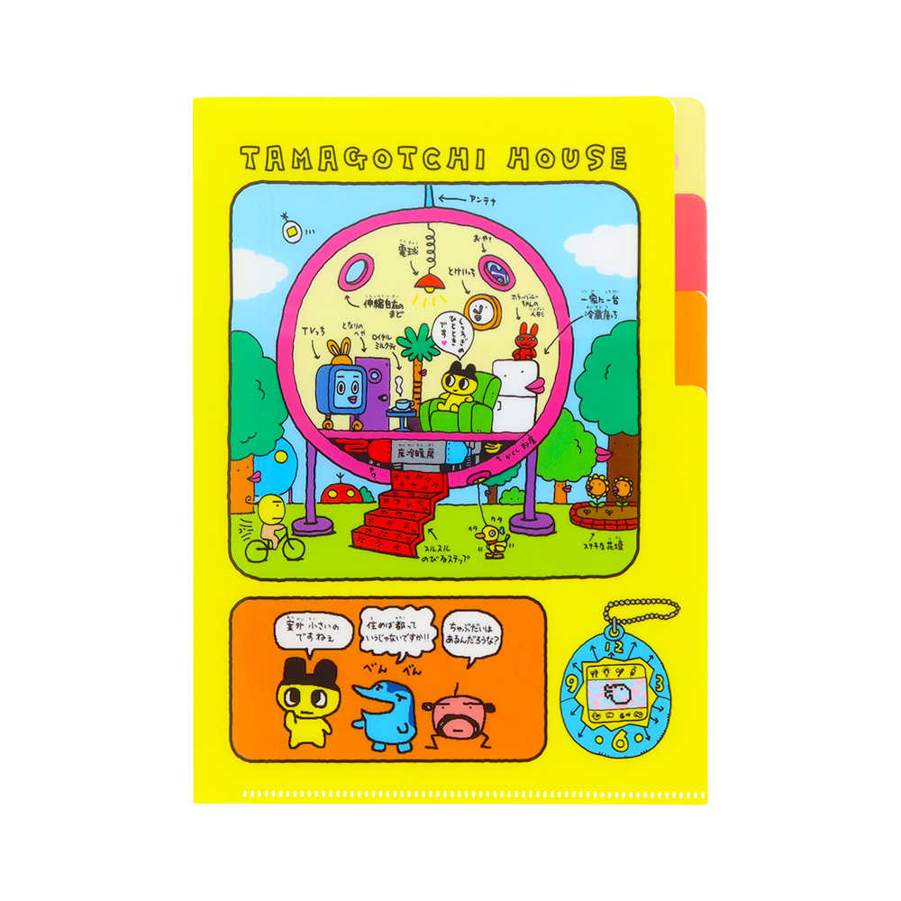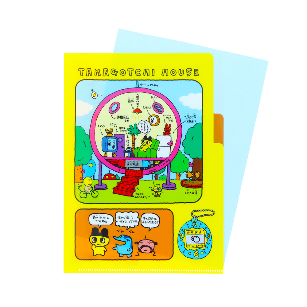 鮮やかなイエローの背景に、たまごっちハウスのイラストをあしらったクリアファイル。