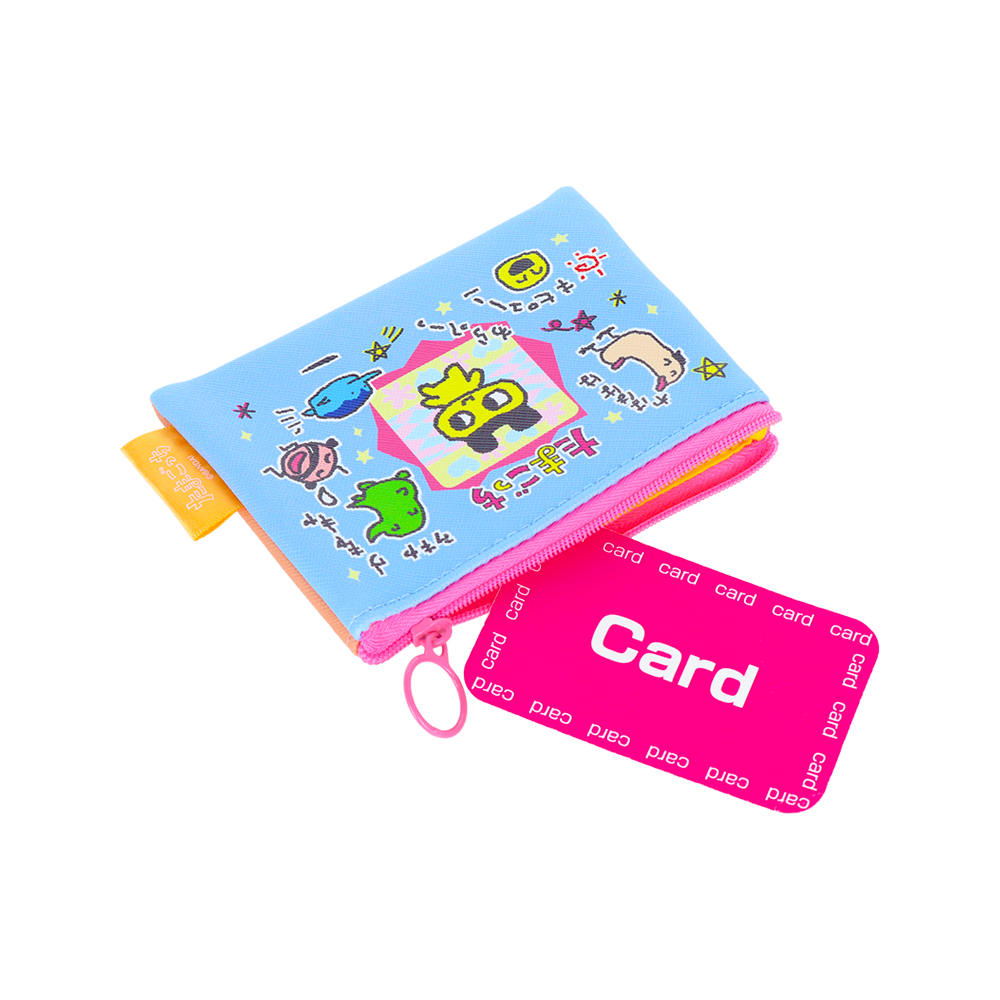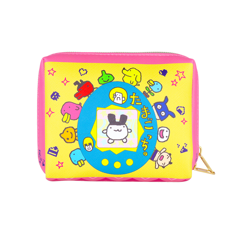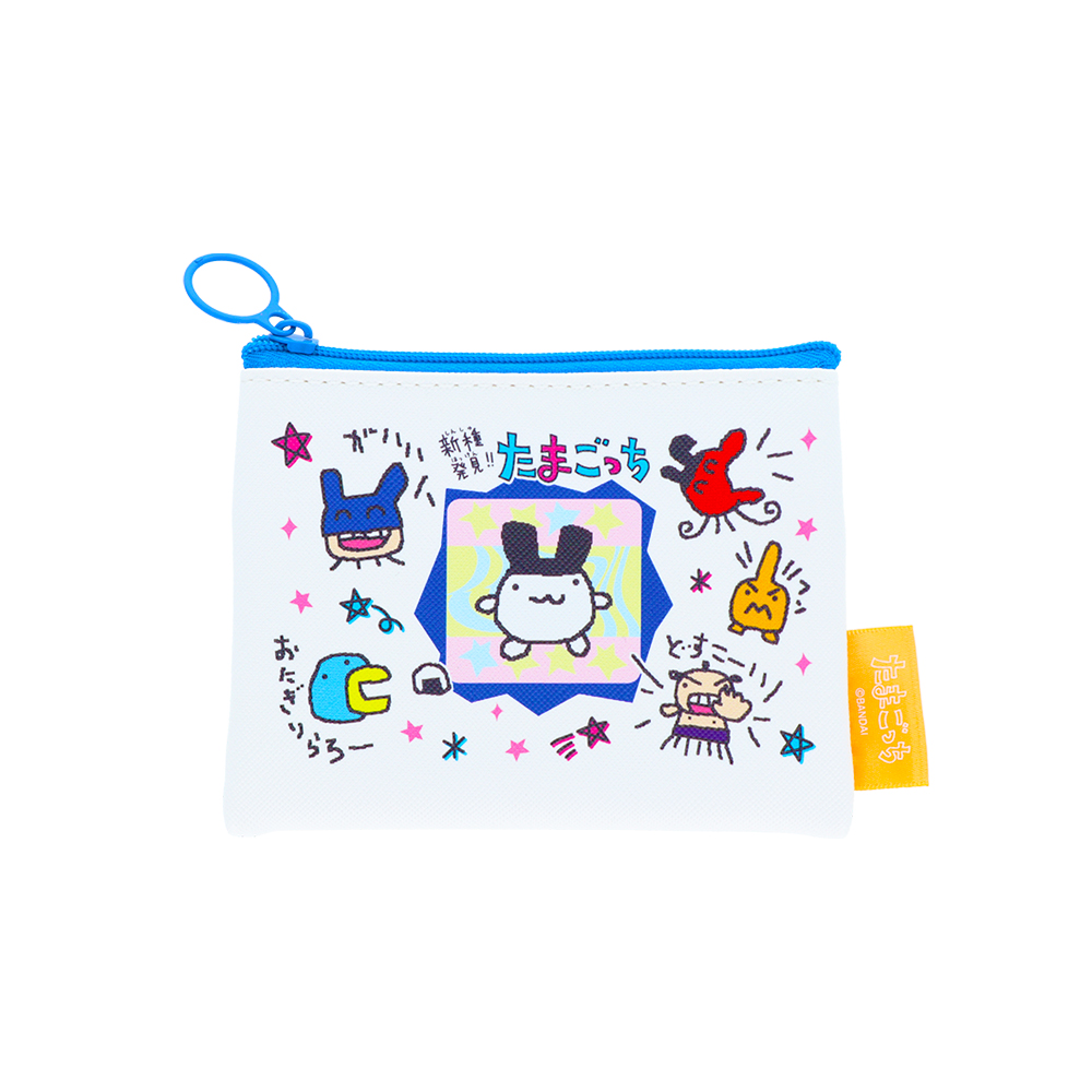 「まめっち」を中心に、楽しそうな「たまごっち」たちが並ぶミニポーチ。