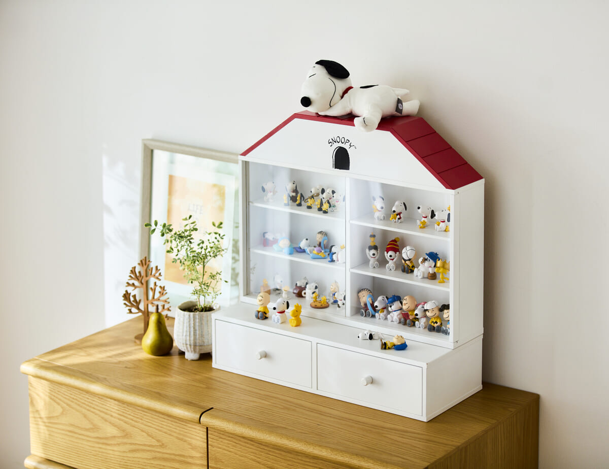 ファンからの「フィギュアなど、小さなコレクションアイテムを飾りながら収納できるものが欲しい」という声に応え、「スヌーピー」の犬小屋をモチーフにしたデザインが採用されています☆