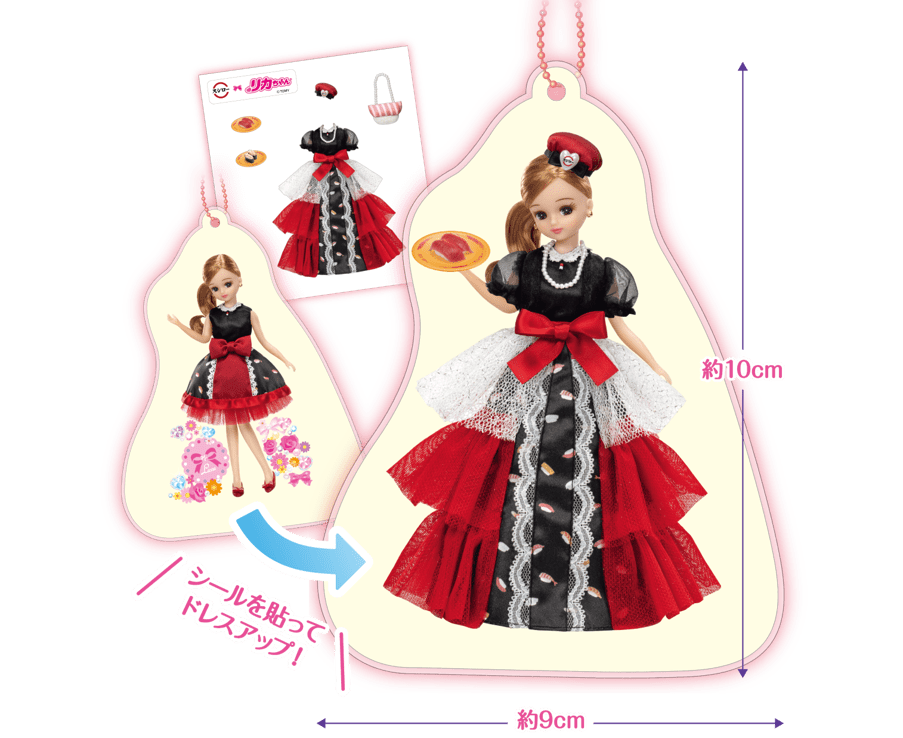 今回のコラボのためにデザインされたスシローオリジナルドレスを着たリカちゃんは、赤いドレスが華やかでかわいい☆