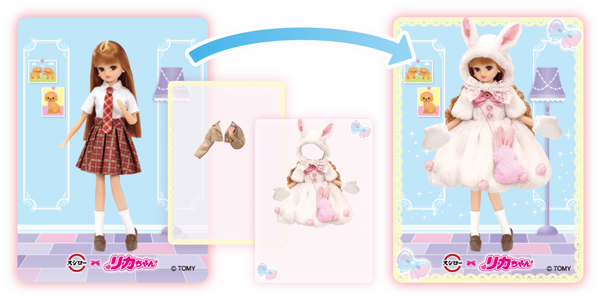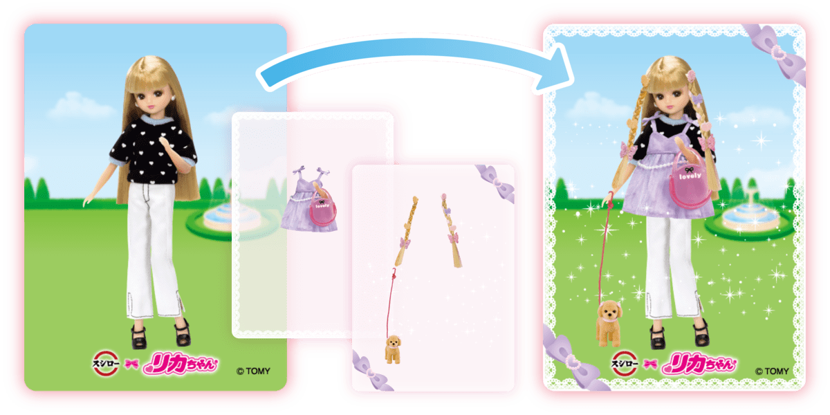 ベースとなるリカちゃんカードに2枚の洋服カード付きで、着せ替えを楽しめます。
