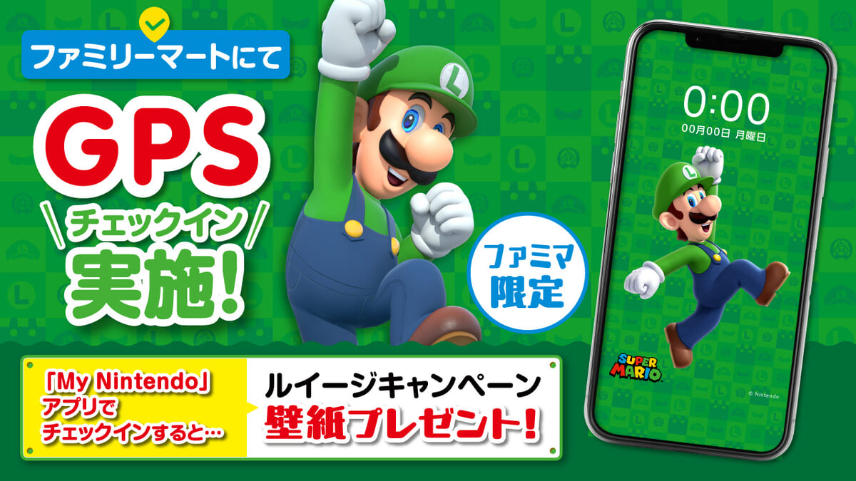 任天堂が提供するスマートフォン向けアプリ『My Nintendo』で、キャンペーン期間中にファミリーマートの店舗で「GPS チェックイン」を実施すると、ルイージの限定オリジナル壁紙をプレゼント☆