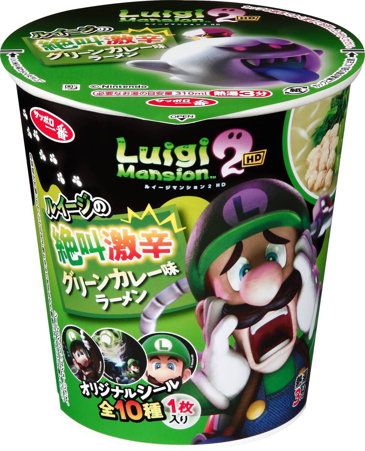 Nintendo Switch™専用ソフト「ルイージマンション2HD」でオバケに遭遇して絶叫するルイージをイメージした辛いグリーンカレー味ラーメンです。