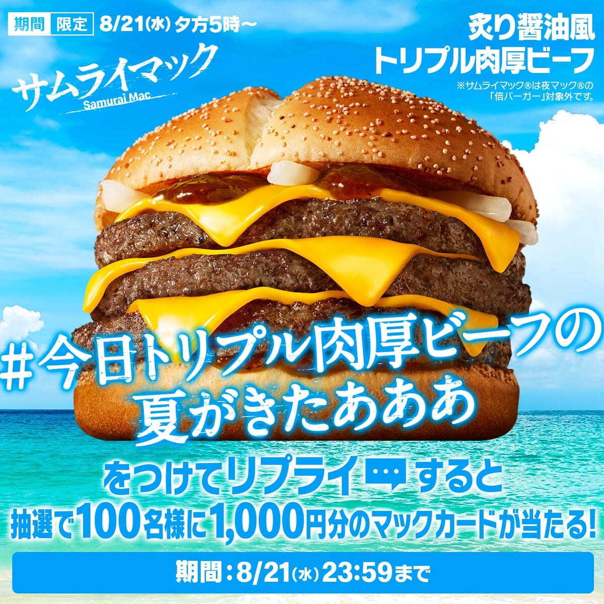応募方法:マクドナルド公式Xアカウント(@McDonaldsJapan)をフォローし、同アカウントから投稿された「#今日トリプル肉厚ビーフの夏が